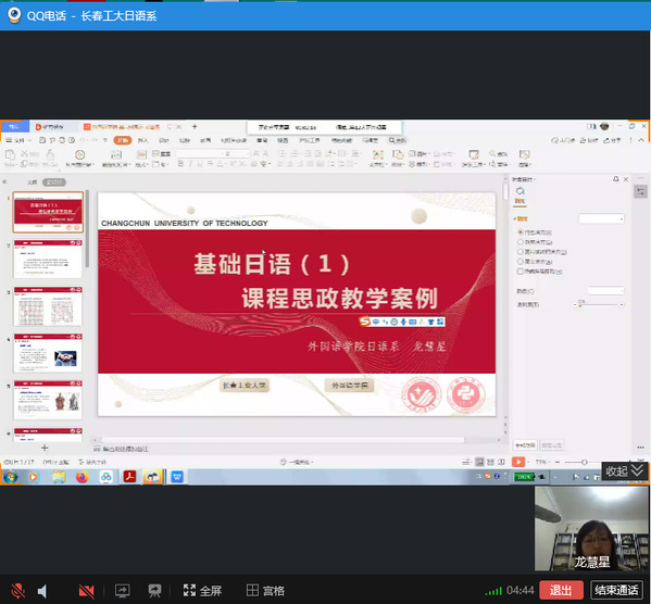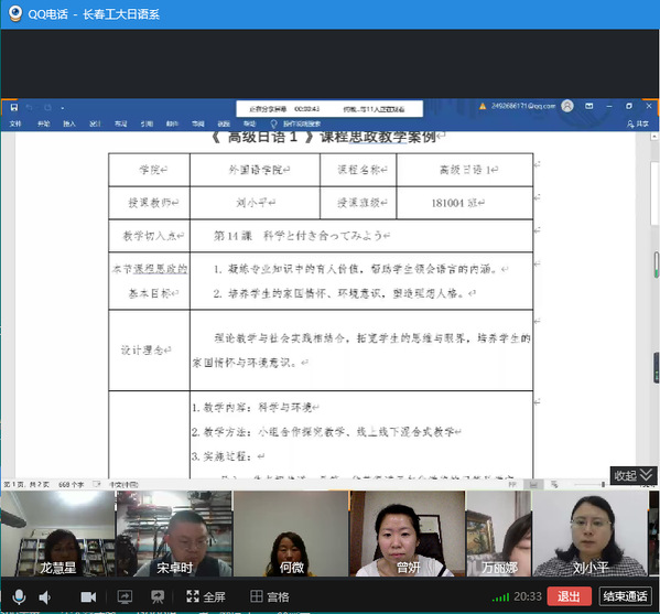 新闻网讯(通讯员 曾妍)按照学校、学院关于开展课程思政建设集中研讨活动的通知,为了进一步学习贯彻落实教育部印发的《高等学校课程思政建设指导纲要》,日语系制定了关于开展课程思政建设活动方案,并于10月9日晚7:30, 在线上QQ工作群平台,召开了“课程思政优秀案例观摩交流会”,日语系主任曾妍主持会议,日语系全体教师参加,副院长周爽观摩了交流会。