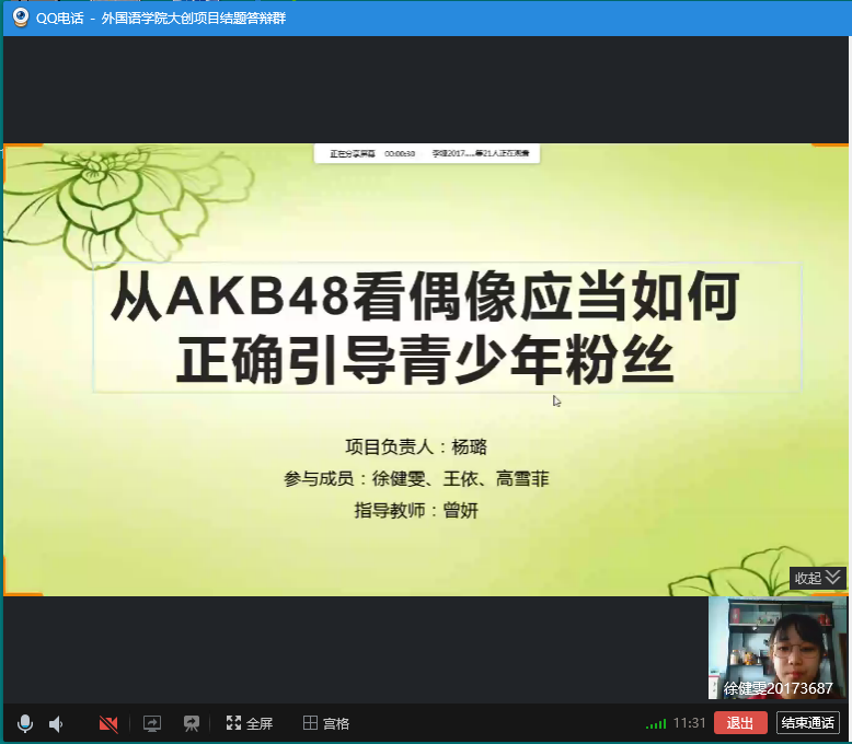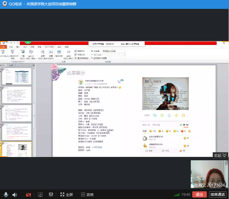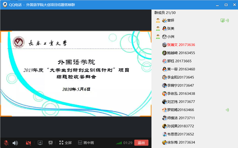 利用QQ网络平台进行了2019年度“大学生创新创业训练计划”项目结题线上验收评审工作。英语系主任刘宇、日语系主任曾妍、俄语系主任张美担任此次结题验收答辩的专家评委。学院副院长周爽全程参加评审验收。
