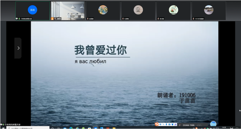 191006班的黑玉在朗读诗歌《Короткий》(短)时说:“我们走过人生各个阶段的历程,会经历困境、逆境,但也有喜悦和收获。如今我们虽然经历疫情,但我们也收获了很多友情、亲情。青春的岁月和热烈的心是为了预见奇妙的缘分和心动的人。把信念练得无坚不摧,把杂念制成防弹衣。我们不用什么怕路途遥远,因为走一步有一步的风景。”
