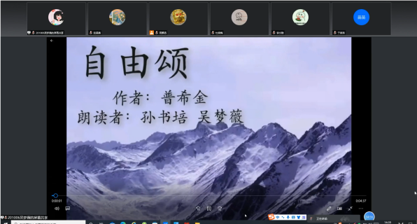 除此之外,还有张金一、 裴芷、刘溪、尚月瑶、于苗苗、孙书培、吴梦薇、刘子慧、薛谨、高雅洒、李扬、陈艺蕊、韦伟真、张瑞欣、张美杰、张瀚文朗读的作品:《К Чадаеву》(致恰达耶夫)、《海燕》、《Я вас любил》(我曾爱过你)、《自由颂》、《假如生活欺骗了你》、《Я помню》(我记得)、《童年》、《我不善于道别》、《俄罗斯文学简介》、《女孩儿们》、《安娜卡列尼娜》《Мне нравится, что вы больны не мной》我喜欢你,你的痛苦不是为我)。同时,20级的俄语系学生带来了青春洋溢的舞蹈表演,在云端老师和同学们也能感受到无限的活力和欢乐。
