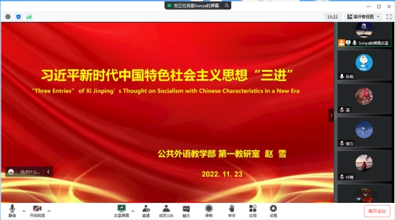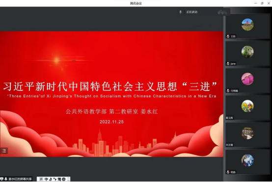 本网讯(通讯员 孙莉)为了贯彻落实《习近平谈治国理政》多语种版本“进高校、进教材、进课堂”工作,将习近平新时代中国特色社会主义思想融入我校大学外语教学研究和人才培养全过程,公共外语教学部分别于11月23日、25日、26日以教研室为单位进行了“习近平新时代中国特色社会主义思想‘三进’”主题教研活动。全体公外部教师参加了本次活动。