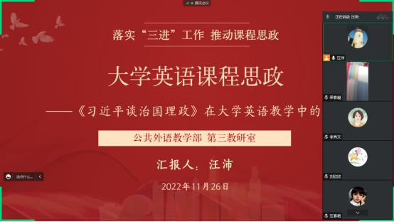 第三教研室汪沛老师做了“大学英语课程思政——《习近平谈治国理政》在大学英语教学中的融入”的报告。以《全新版大学高阶英语综合教程3》为例,向大家展示了如何将习近平新时代中国特色社会主义的理论成果融入课堂,真正做到“入教材” 、“入课堂”、“入头脑”。