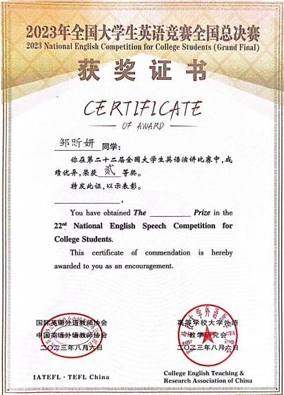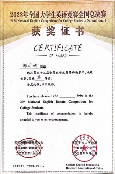 教师孙莉作为邹昕妍的指导教师在本次全国大学生英语竞赛中,荣获演讲比赛“优秀指导教师”、英语辩论赛“优秀指导教师”两项荣誉。