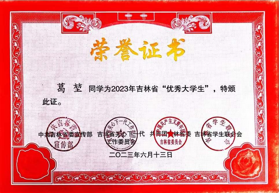 葛堃同学在2023年吉林省“优秀大学生”寻访活动中获得“优秀大学生”荣誉称号。