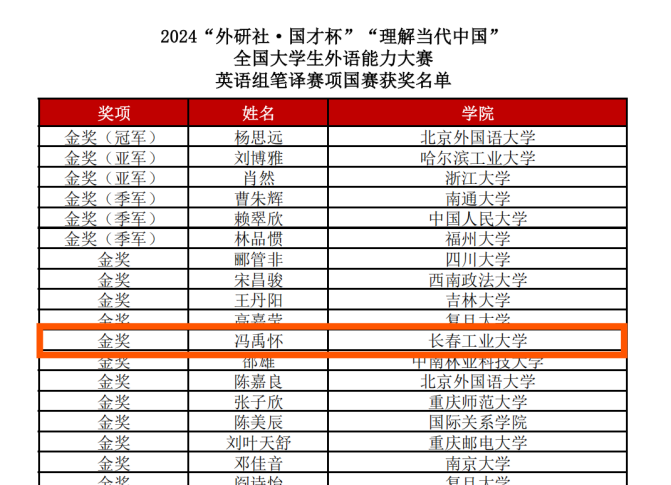 张力和汪沛老师指导的国际教育学院学生冯禹怀入围英语组笔译比赛国赛,并最终取得了国家级金奖的好成绩。这是我校在该项赛事中取得的最好成绩。