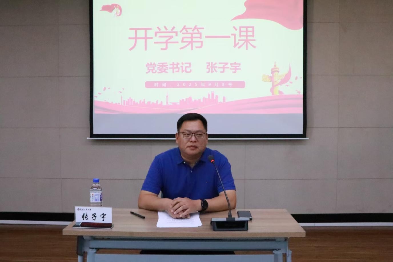 党委书记张子宇在学院多功能报告厅,为新生讲授“开学第一课”:校史润初心,担当启新程。