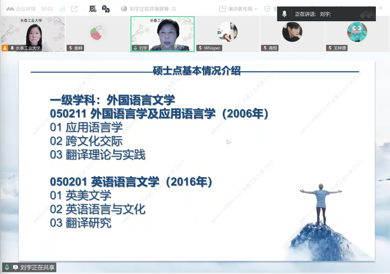 刘宇介绍了英语系的办学历史、取得成就,重点介绍了英语语言文学和外国语言学及应用语言学两个方向的硕导团队,帮助学生分析了近三年全国的考研形势,包括考研人数和录取分数变化,举例说明了我校研究生的毕业去向,并详细解读了今年两个方向的命题形式变化。