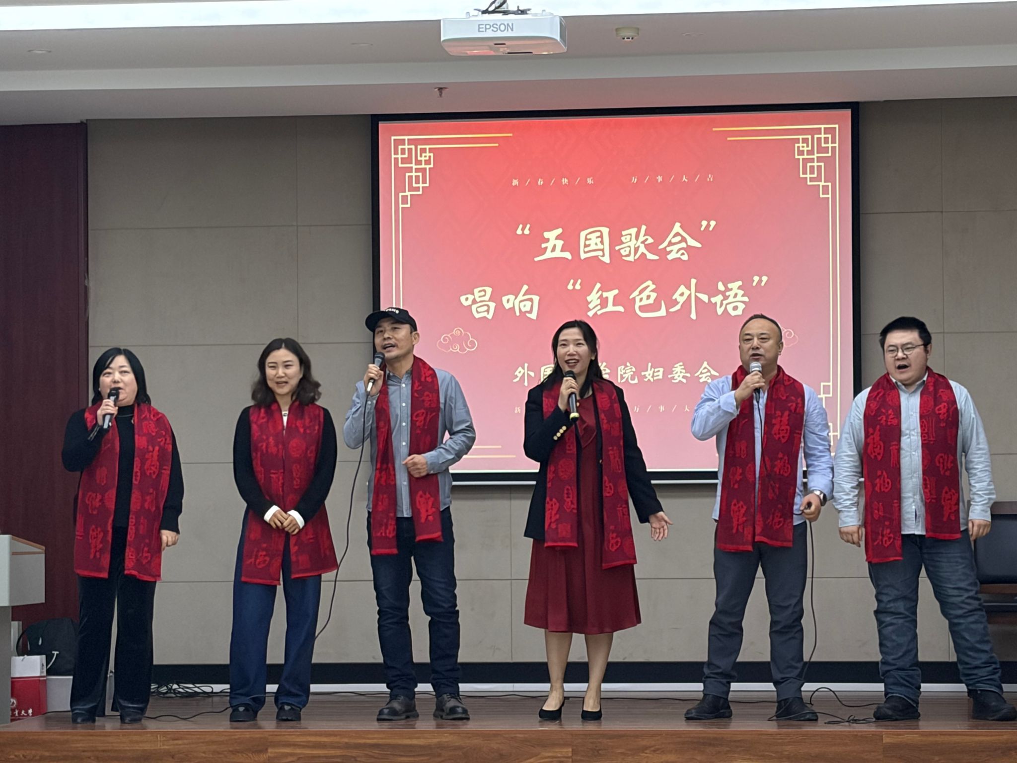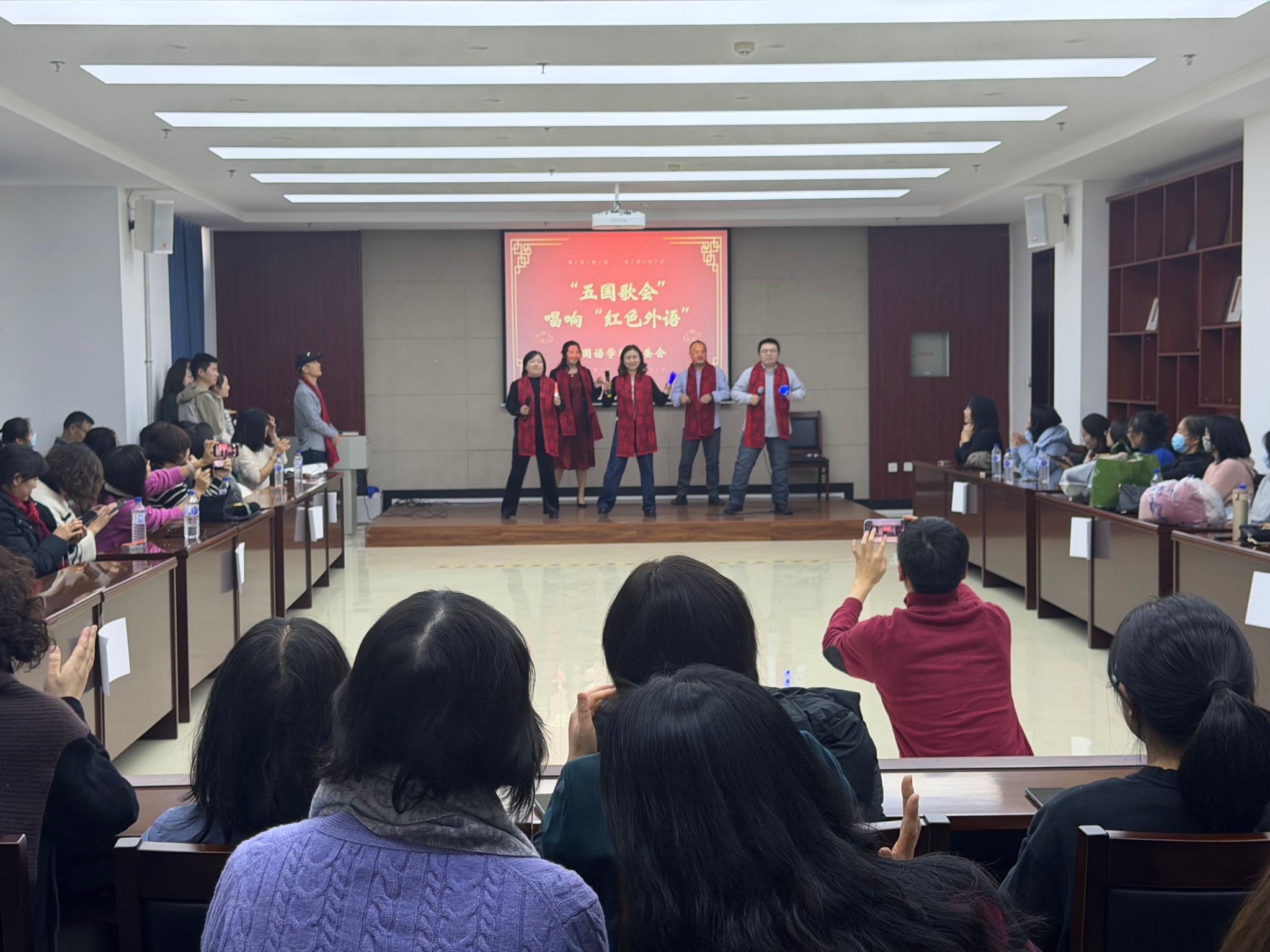 歌会现场氛围热烈,亮点纷呈。教师分为多个语言小组,依次登台演唱。中文歌曲旋律激昂,点燃了现场的爱国热情;英文歌曲以独特的语言韵味,让红色经典焕发出别样魅力;日语、俄语、朝语演唱的红色曲目,则凭借标准的发音、真挚的情感,展现了教工扎实的语言功底和对红色文化的深刻理解。每一首歌曲都赢得了现场阵阵掌声,歌声交织成一曲跨越语言的爱国赞歌。