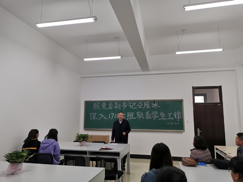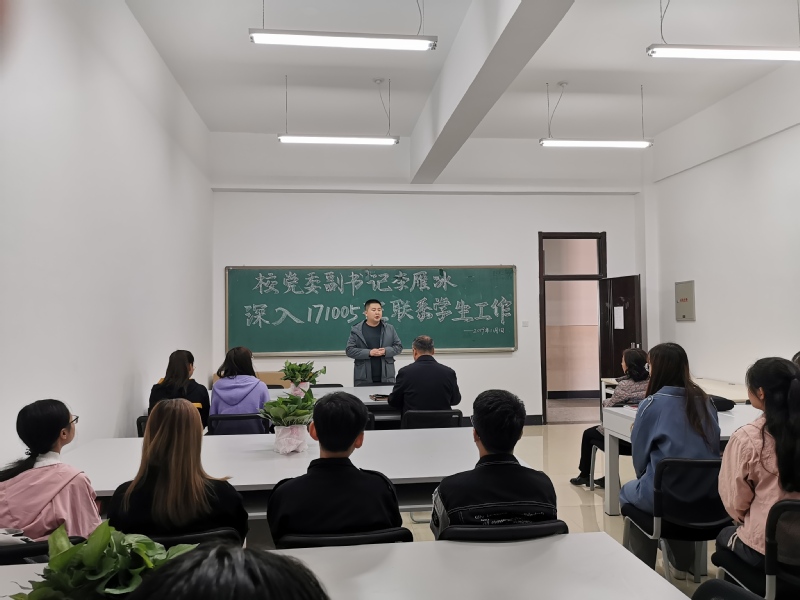 领导干部深入基层联系学生工作实施方案》要求,深入基层学院,进入学生班级,与学生“面对面”,把思想政治工作真正做到学生心坎上,校党委副书记李雁冰再次来到对接班级171005班,了解学生情况,解决学生困难。本次联系工作气氛热烈,效果显著,师生共同期待下次见面。